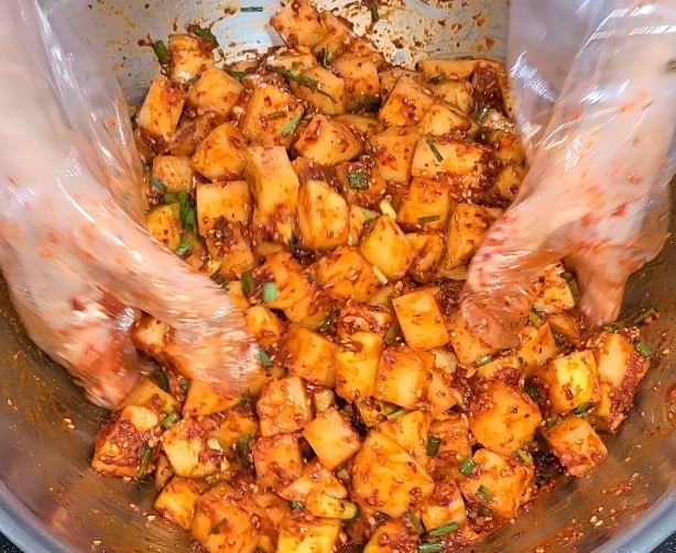 먼저 고운 고추가루를 넣고 버무려 무에 색을 입혀줍니다.
